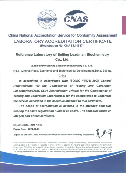 参考实验室于2018年8月向CNAS提交认可申请,9月通过文审,CNAS评审专家组于11月10日-11月11日对九游(中国)参考实验室进行现场评审。经过审核文件、现场检查、现场实验等方式的审查,CNAS评审专家组一致同意通过现场评审。参考实验室于2018年12月26日获得CNAS参考实验室ISO17025和ISO15195的认可证书,认可范围包括ALT、AST、GGT、ALP、AMY、CK、LDH七个酶学参考测量程序。