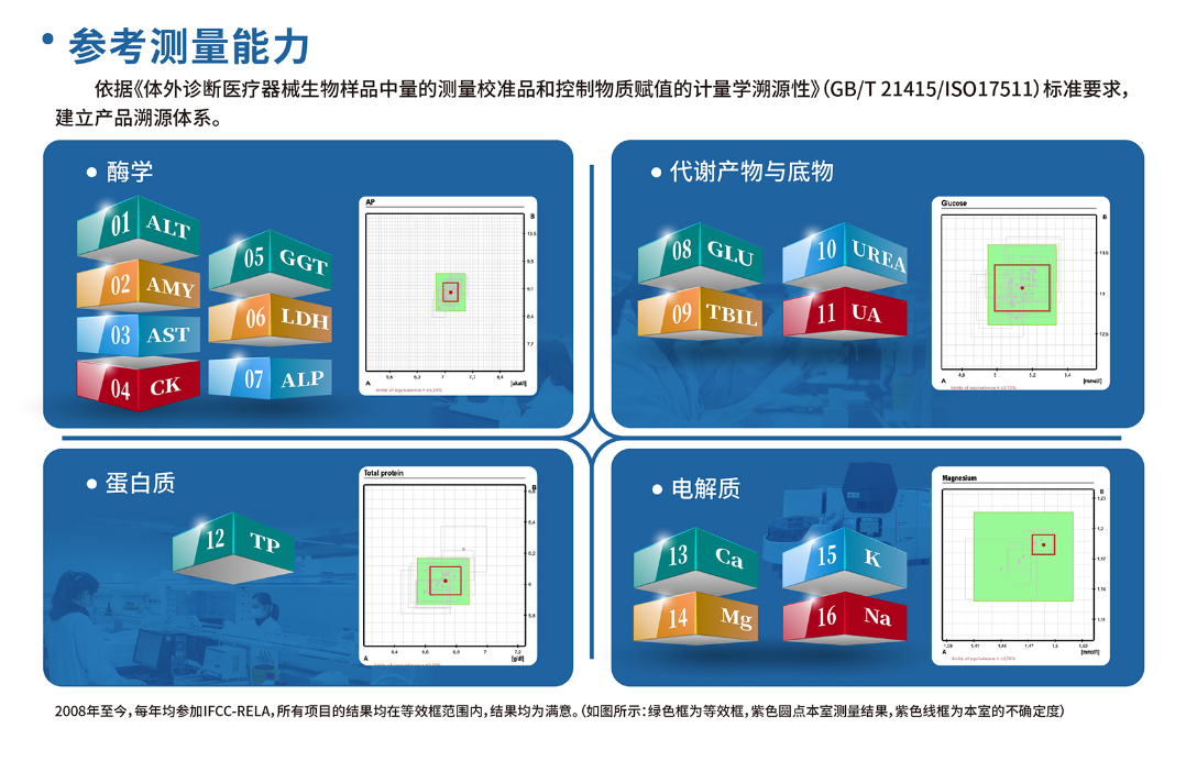 九游(中国)医学参考实验室致力于公司产品溯源体系的建立和维护,主要承担建立量值溯源及参考方法,参加国内外权威机构组织的能力验证,完成企业校准品的研制、赋值、监测及管理的相关工作,为公司产品质量保驾护航。发展历程:2006年,正式组建2008年,首次通过IFCC-RELA酶学项目2009年,首次通过IFCC-RELA代谢产物与底物项目2010年,首次通过IFCC-RELA蛋白质项目2011年,首次通过IFCC-RELA离子类项目(我国首家将原子吸收平台应用于离子参考测量的实验室);起草行业标准YY/T 1195-2011《血清总蛋白参考测量程序》(我国首个生化诊断领域参考方法行业标准)2014年,依据ISO/IEC ISO17025和ISO15195建立实验室质量管理体系2015年,完成北京市专项课题《医疗器械(体外诊断试剂)检测与参考品评价服务平台》(与中国食品药品检定研究院合作)2018年,获得CNAS认可2019年,完成北京市科技计划课题《G20工程龙头企业培育——生化诊断试剂质量性能评价研究及标准品体系建立》(与卫生部临检中心、北京市医疗器械检验所等单位合作)2021年,进入JCTLM参考测量服务实验室数据库2022年,CNAS扩项评审通过,我司医学参考实验室获CNAS认可的项目共计12项