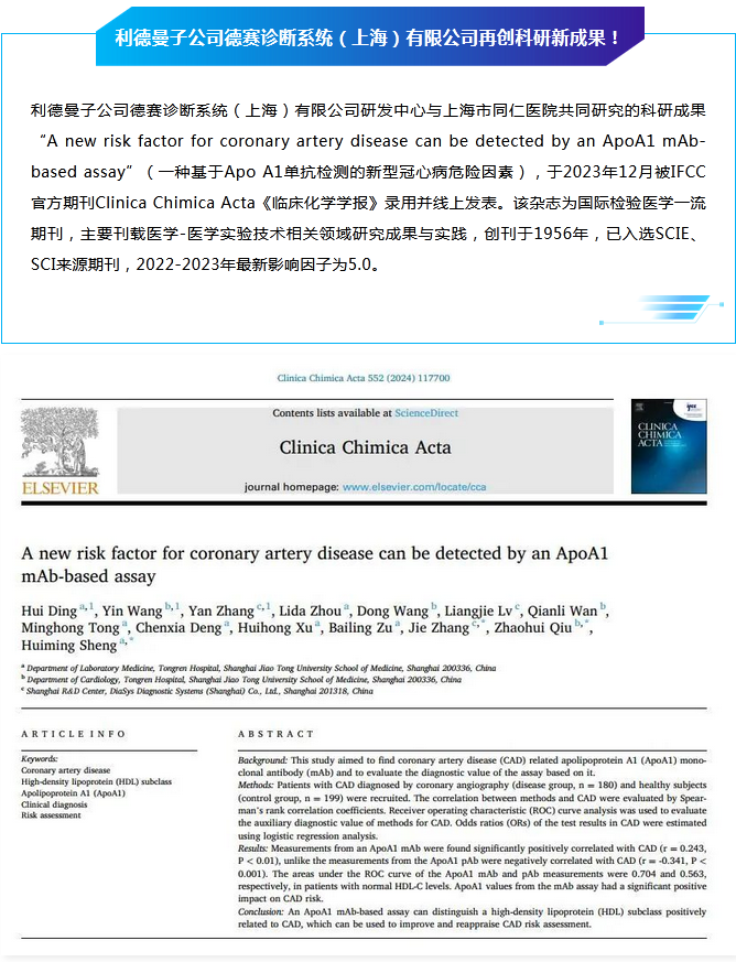 科研创新 │ 九游(中国)子公司德赛诊断系统(上海)有限公司联合上海市同仁医院再创科研新成果