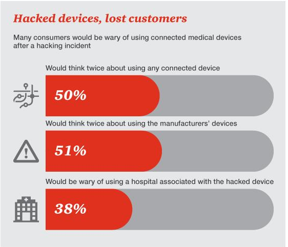网络安全状况不佳会给医疗系统和设备制造商带来巨大的损失。如果某医院或制造商曾发生过黑客入侵事件,消费者便会对其产品产生质疑。其中50%的消费者会慎重考虑是否使用任何互联医疗设备;51%会慎重考虑是否使用发生问题的这家制造商的设备;38%会慎重考试是否使用与黑客入侵设备相连的医院。62%的消费者表示,比起设备的易用性,他们更在乎设备的安全性。那些没有内嵌安全功能的设备,特别是面向消费者的APP或可穿戴设备,可能会在竞争中处于不利地位。